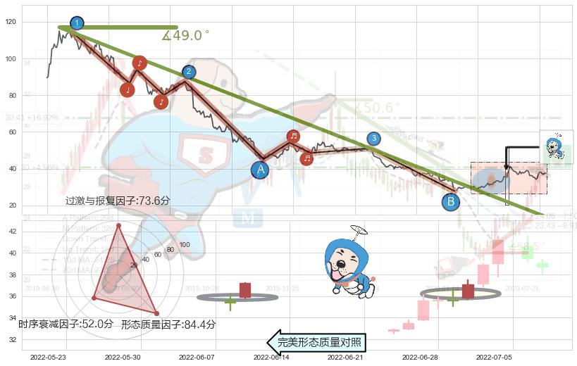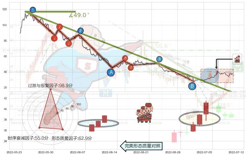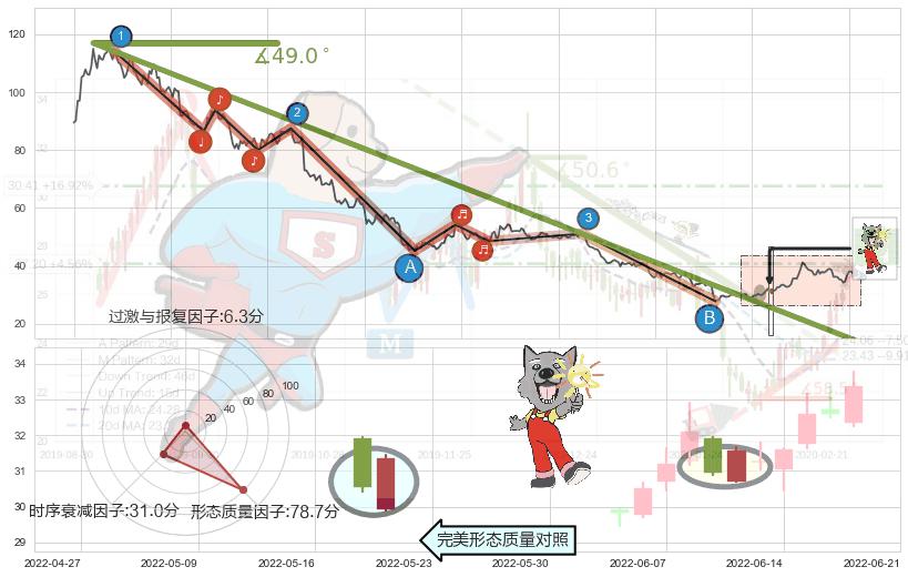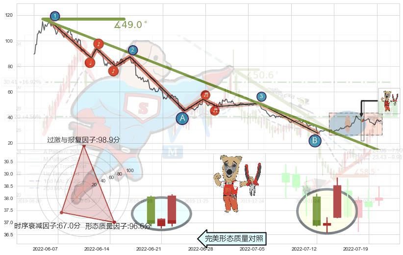 从2020-12-25至2022-07-01,共包含366个交易日,阶段股价下跌-97.37%,阶段股价变动位移路程比: 1 : 6,下跌趋势角度: 49.0