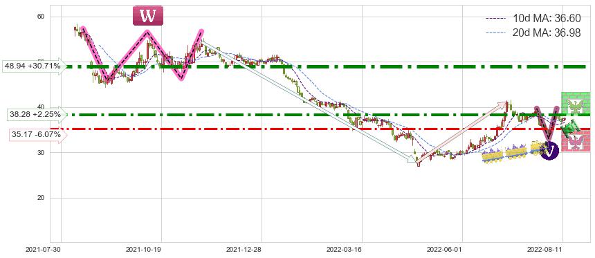 ♘ 支撑价格位35.17,可信任强度64.56%,距离最后交易2022-08-12形成的收盘价格37.44相差 -6.07%