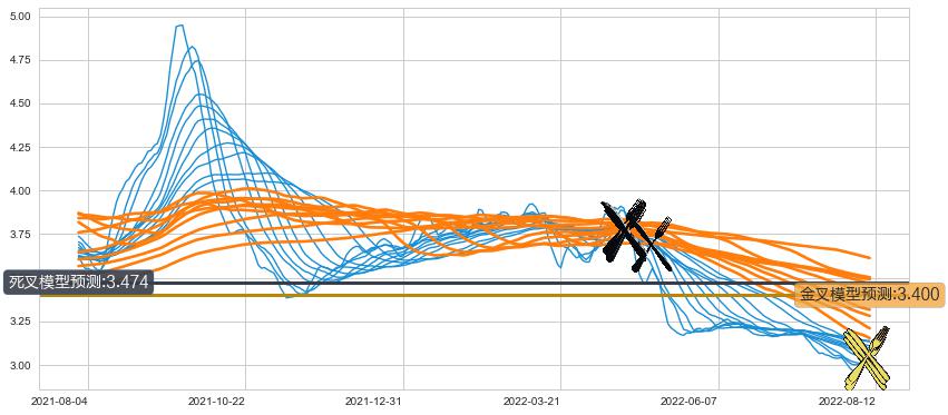 ➣ 60小时均线于(2022-04-19: 3.786)形成【死叉】基于【死叉历史模型】预测死叉后最低波谷价格: 3.481, 死叉后最低价格2.910,已经下跌超出预测最低波谷价格, 预期反弹