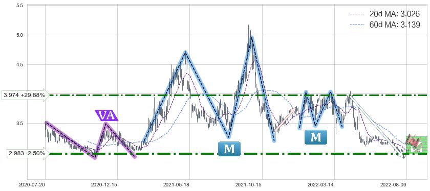 ♘ 阻力价格位3.974,可信任强度68.30%,距离最后交易2022-08-12形成的收盘价格3.060相差 +29.88%