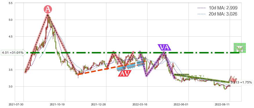 ♘ 阻力价格位4.01,可信任强度93.32%,距离最后交易2022-08-12形成的收盘价格3.060相差 +31.01%