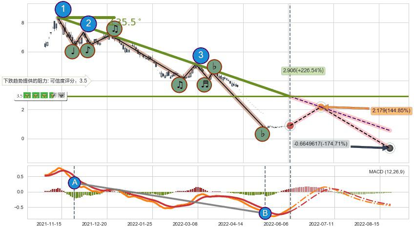 ♘ 在最后的下跌阶段2021-11-11至2022-05-23,存在 持续未破位的阻力位 ,阻力价格2.906,可信任强度77.99%,其距离最后价格0.8900相差 +226.54%