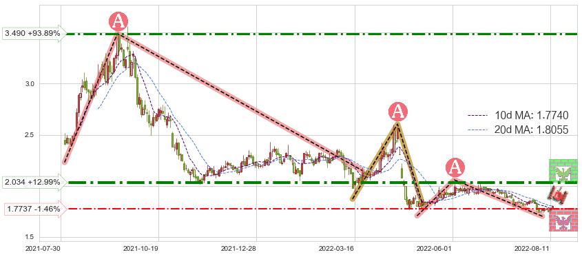 ♘ 阻力价格位3.490,可信任强度57.08%,距离最后交易2022-08-12形成的收盘价格1.8000相差 +93.89%
