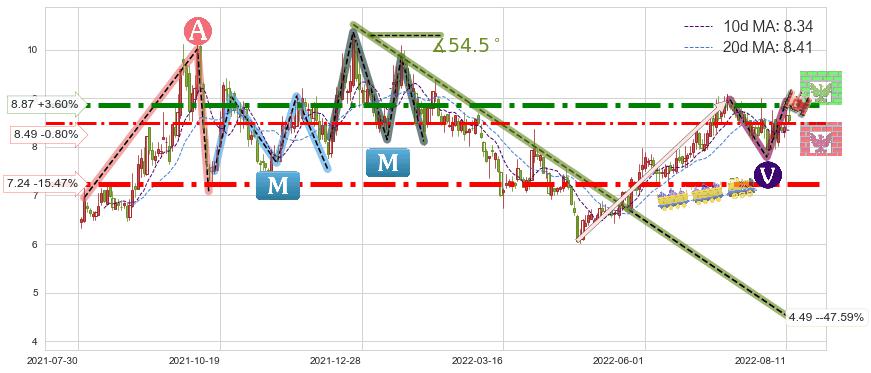 ♘ 阻力价格位8.87,可信任强度93.81%,距离最后交易2022-08-12形成的收盘价格8.56相差 +3.60%