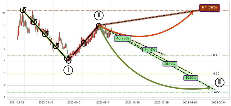 ➢ 循环浪继续向下【最低】位置(2023-05-01, 3.422),匹配聚类样本比例22.36%, 可能性概率10.90%