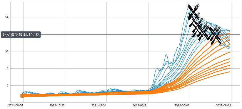 ➣ 55小时均线于(2022-07-14: 12.12)形成【死叉】基于【死叉历史模型】预测死叉后最低波谷价格: 11.74, 死叉后最低价格10.17,已经下跌超出预测最低波谷价格, 预期反弹