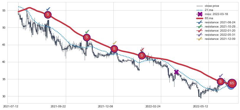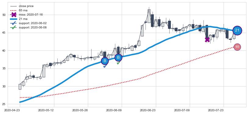 ➣ 65小时均线于(2022-06-10: 33.70)形成【金叉】基于【金叉历史模型】预测金叉后最高波峰价格: 41.99, 金叉后最高价格42.75,虽然已经到达预测最高波峰价格,但耗时间很短动能很强, 预期继续上涨