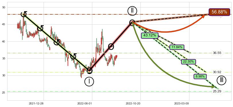 ➣ D点拟合预测价格48.09,距离最后交易收盘价格35.56相差 +35.23%