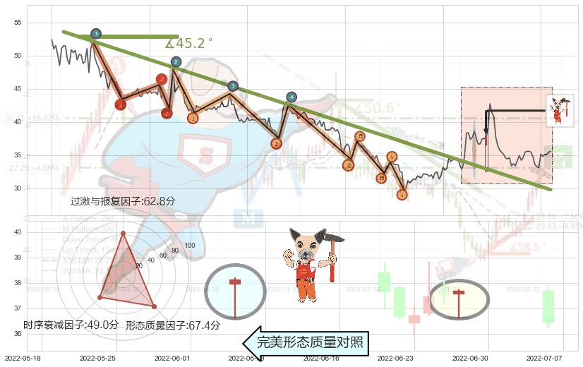 从2021-10-29至2022-05-25,共包含138个交易日,阶段股价下跌-37.58%,阶段股价变动位移路程比: 1 : 5,下跌趋势角度: 58.8