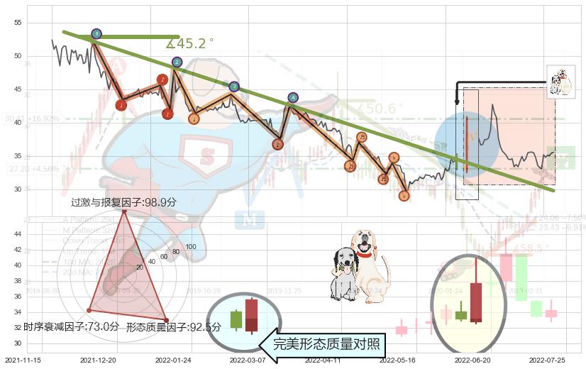 从2021-08-03至2022-05-25,共包含194个交易日,阶段股价下跌-42.63%,阶段股价变动位移路程比: 1 : 7,下跌趋势角度: 45.2