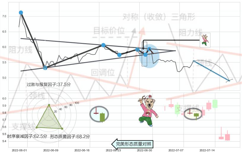 ➣ 【多空双方观望→争持→促使价格波动日益狭窄→空方打破攻守平衡点】对称三角形中继整理, 已在2022-07-15突破【支撑】颈线 5.78 →演变成下降通道