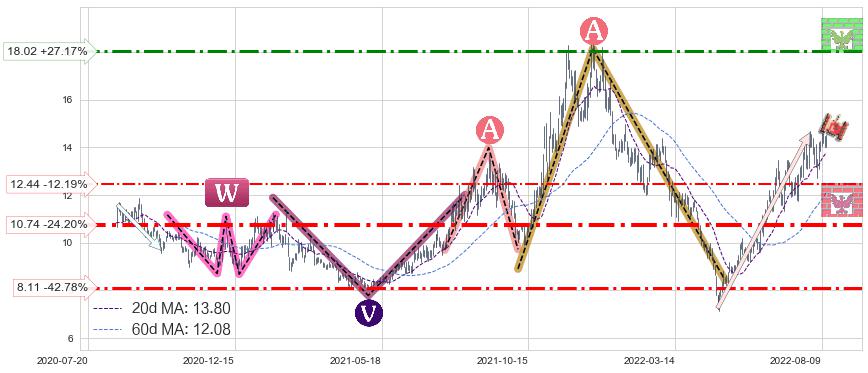 ♘ 支撑价格位10.74,可信任强度74.30%,距离最后交易2022-08-12形成的收盘价格14.17相差 -24.20%