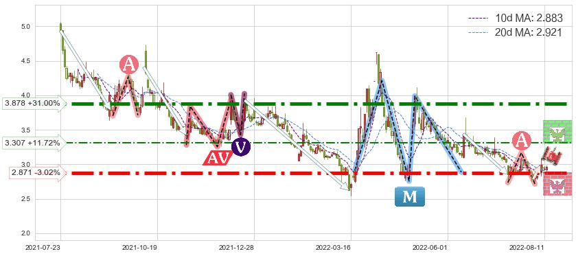 ♘ 阻力价格位3.307,可信任强度43.11%,距离最后交易2022-08-12形成的收盘价格2.960相差 +11.72%