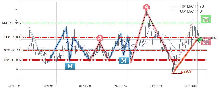 ♘ 支撑价格位11.22,可信任强度66.51%,距离最后交易2022-08-12形成的收盘价格11.35相差 -1.12%