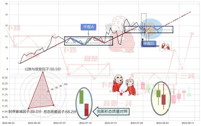 ➣ 【中枢B】:2022-07-29-2022-08-11,中枢由4笔构成,共10交易日, ZG=11.92, ZD=11.60