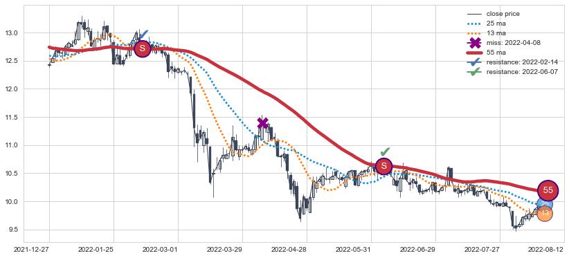 ➣ 55小时均线于(2022-02-21: 12.71)形成【死叉】基于【死叉历史模型】预测死叉后最低波谷价格: 11.83, 死叉后最低价格9.52,已经下跌超出预测最低波谷价格, 预期反弹