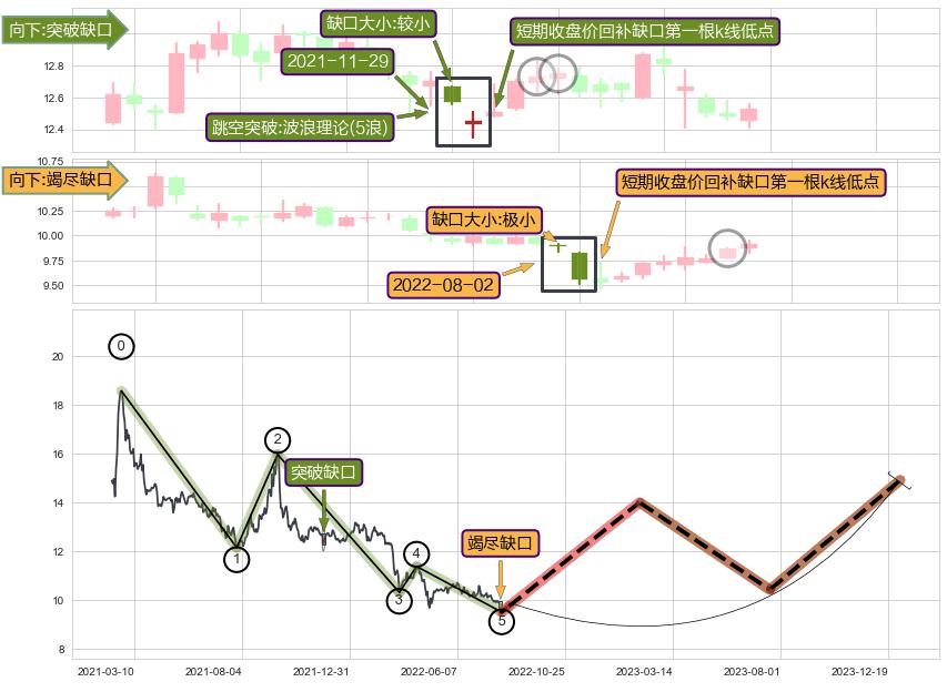 ➢ 突破缺口形成后,后续k已经超过14根,跳空突破波浪理论(5浪)关键点后, 出现【完全回踩】迹象,短期收盘价回补缺口第一根k线低点