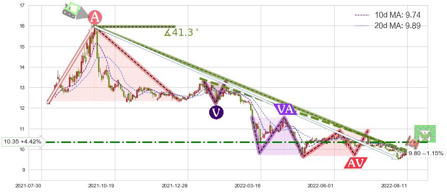 🦴 长线均值回复组合短线趋势跟踪[强阻力信号]2021-09-22-2022-08-11下跌趋势依然成立(下跌趋势跟踪依然存在),短线价格略微上行反弹(均值回复猜想),即将接近下跌趋势提供的未破位阻力价格:9.80。