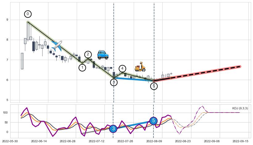 ➢ 第三,五驱动浪端点:【KDJ】走势出现【常规背离 & 反转信号】背离程度99.00%,背离夹角角度59.0˚,背离程度较大