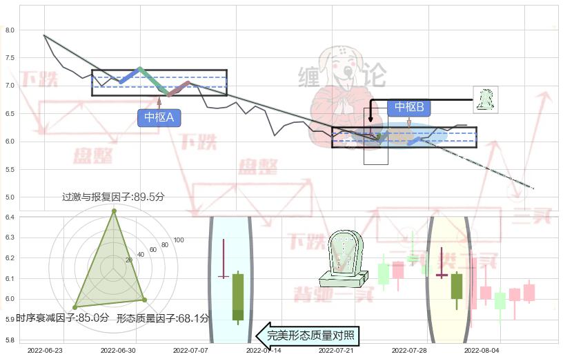 ➣ 【中枢B】:2022-08-01-2022-08-05,中枢由4笔构成,共5交易日, ZG=6.05, ZD=6.00
