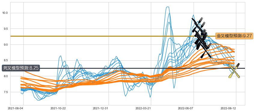 ➣ 34小时均线于(2022-06-20: 9.14)形成【死叉】基于【死叉历史模型】预测死叉后最低波谷价格: 8.43, 死叉后最低价格8.01,已经下跌超出预测最低波谷价格, 预期反弹