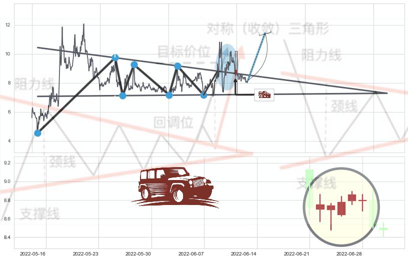 ➣ 【多空双方观望→争持→促使价格波动日益狭窄→多方打破攻守平衡点】对称三角形中继整理, 已在2022-04-01突破【阻力】颈线 8.81 →演变成上升通道