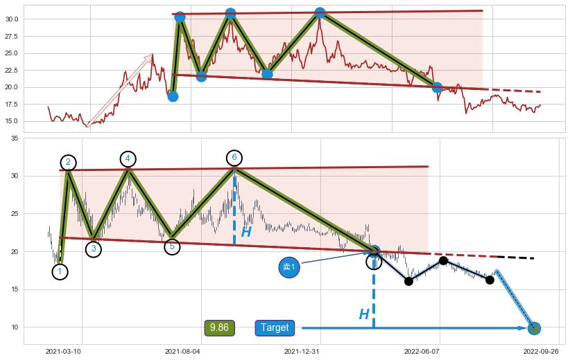 ➢ 最小反转跌幅→𝐇: 10.14 (逐步抬高阻力斜边最后的阻力点⑥与支撑边垂直距离)
