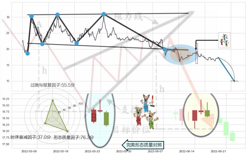 ➣ 下跌螺旋桨 + 扩散三角反转支撑破位转换阻力下跌信号叠加后【目标达成率】中等,【看空】信号叠加【存续影响中等】