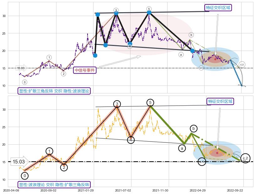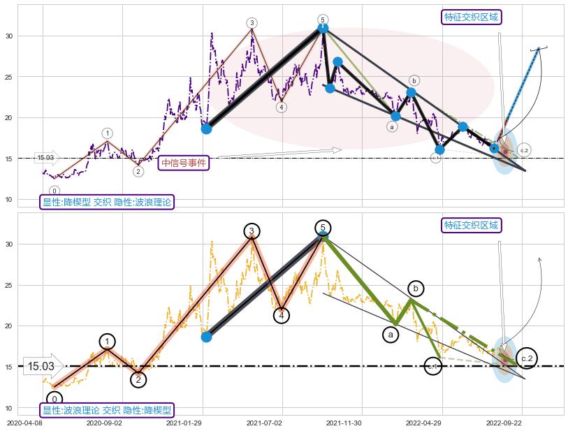 ➣ 波浪理论:临近C点,猜想击穿破位c点后继续下跌 → 下跌 → 风险信号 → 小趋势跟踪