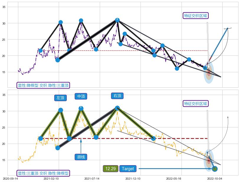 ➢ 三重顶:猜想预期下跌目标target即将达成,随后猜想强支撑来临,预期反弹上涨(均值回复)