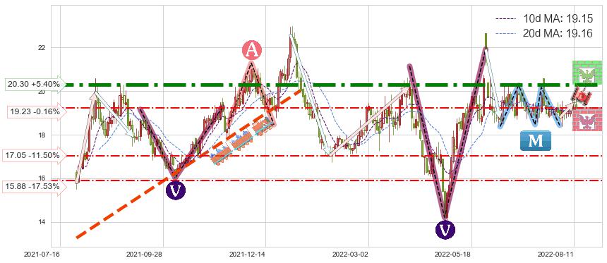 ♘ 阻力价格位20.30,可信任强度93.85%,距离最后交易2022-08-12形成的收盘价格19.26相差 +5.40%