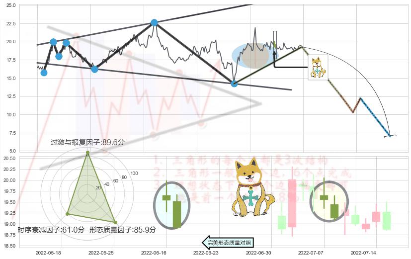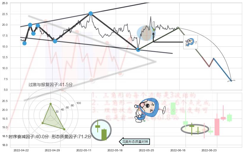 ➢ 下降插入线(坠落线) 🔜 扩散三角反转临近支撑猜想转换阻力下跌 综合量化分数:44.28 【偏空】