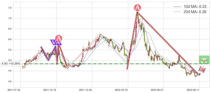 ♘ 阻力价格位4.83,可信任强度50.00%,距离最后交易2022-08-12形成的收盘价格4.38相差 +10.29%