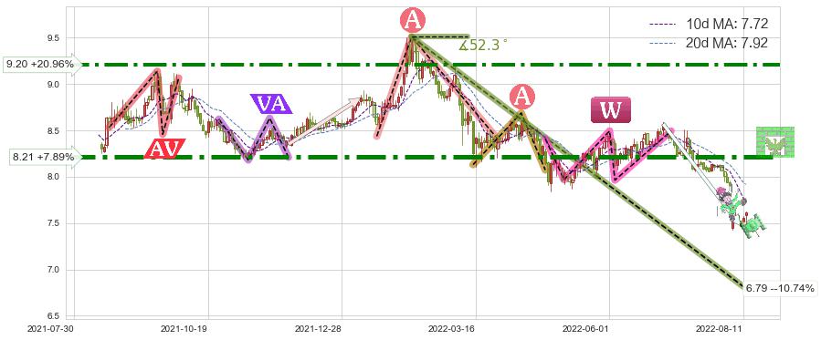♘ 阻力价格位8.21,可信任强度86.32%,距离最后交易2022-08-12形成的收盘价格7.61相差 +7.89%