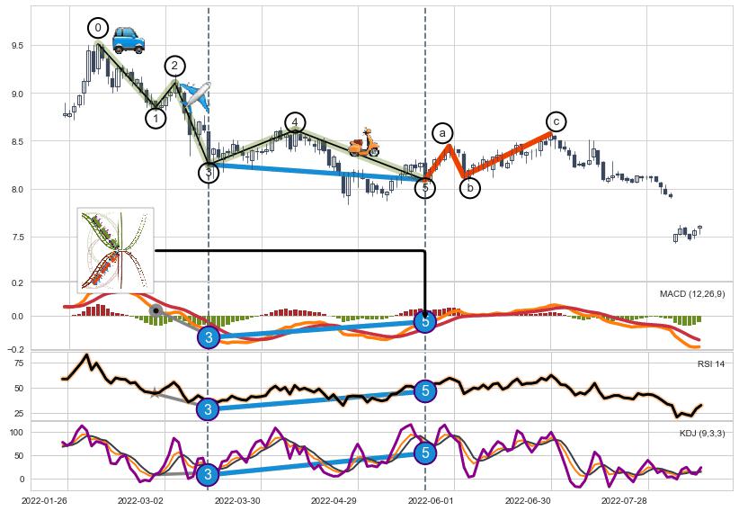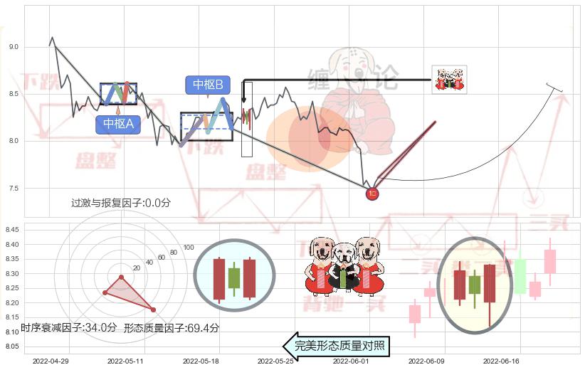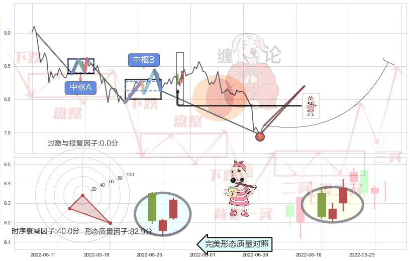 ➣ 【中枢B】:2022-05-11-2022-06-06,中枢由5笔构成,共18交易日, ZG=8.27, ZD=8.13