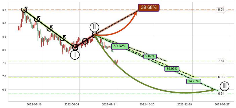 ➣ 循环浪继续向下【平均值】位置(2023-01-04, 6.96),匹配聚类样本比例59.60%, 可能性概率35.95%