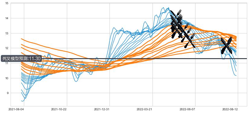 ➣ 95小时均线于(2022-05-05: 13.11)形成【死叉】基于【死叉历史模型】预测死叉后最低波谷价格: 11.64, 死叉后最低价格9.94,已经下跌超出预测最低波谷价格, 预期反弹