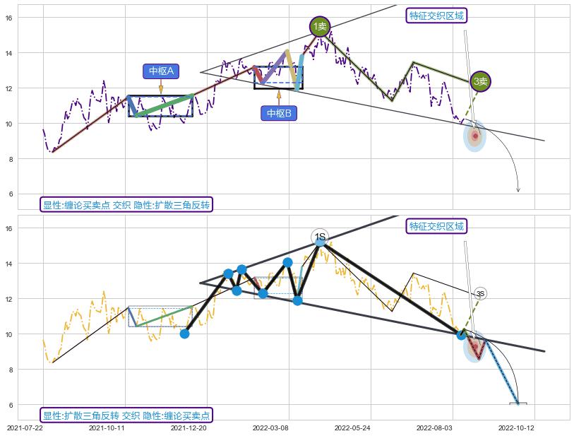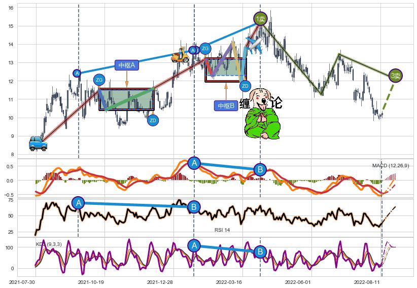 ➣ 【中枢B】:2022-02-07-2022-03-18,中枢由5笔构成,共30交易日, ZG=13.17, ZD=12.28