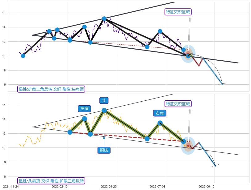 ➣ 扩散三角反转:猜想临近关键支撑位突破点 → 临近拐点下跌 → 风险信号 → 大趋势均值回复