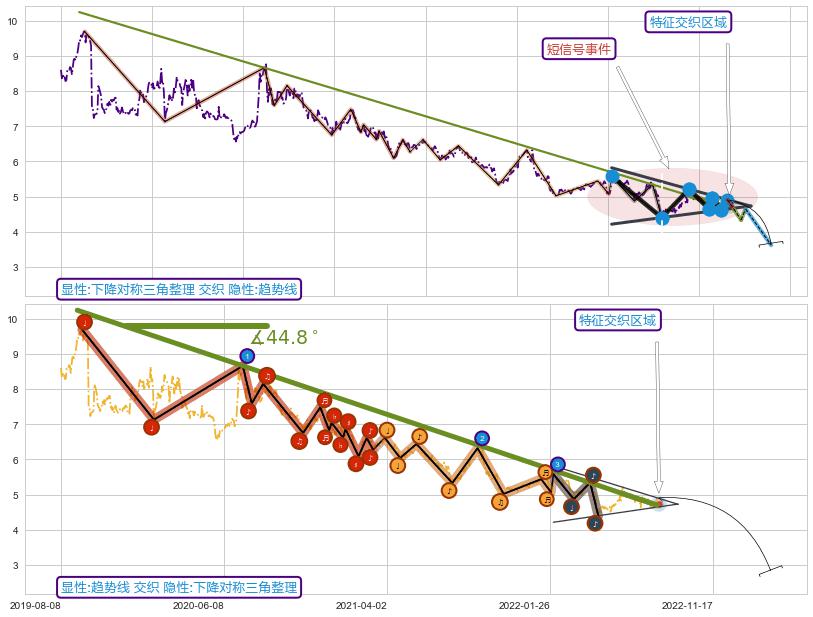 ➢ 下降对称三角整理属【短级别信号事件】趋势线属【长级别信号事件】长短周期组合信号事件, 短长事件长度比18.03%