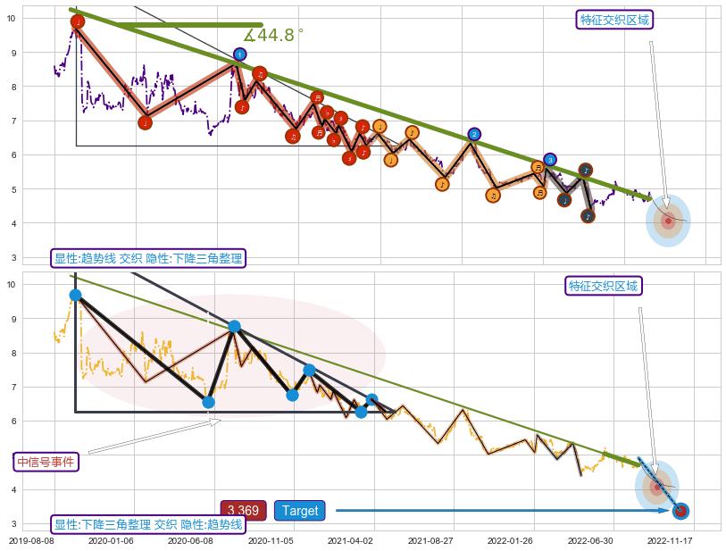 ➣ 下降对称三角整理:猜想临近关键支撑位突破点 → 临近拐点下跌 → 风险信号 → 大趋势均值回复