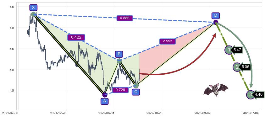 ➣ 谐波蝙蝠:b下跌接近c:猜想支撑性拉升 → 上涨 →【拐点】支撑临近 → 大趋势均值回复