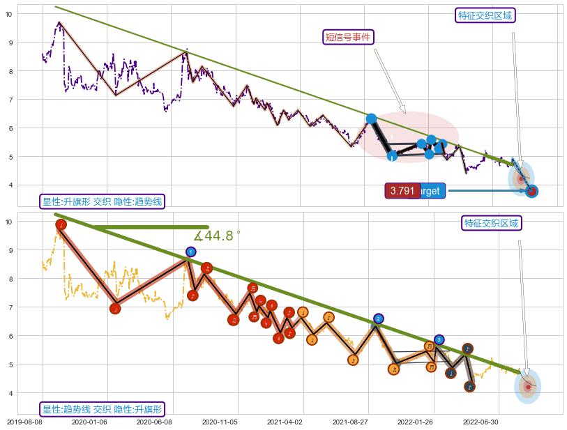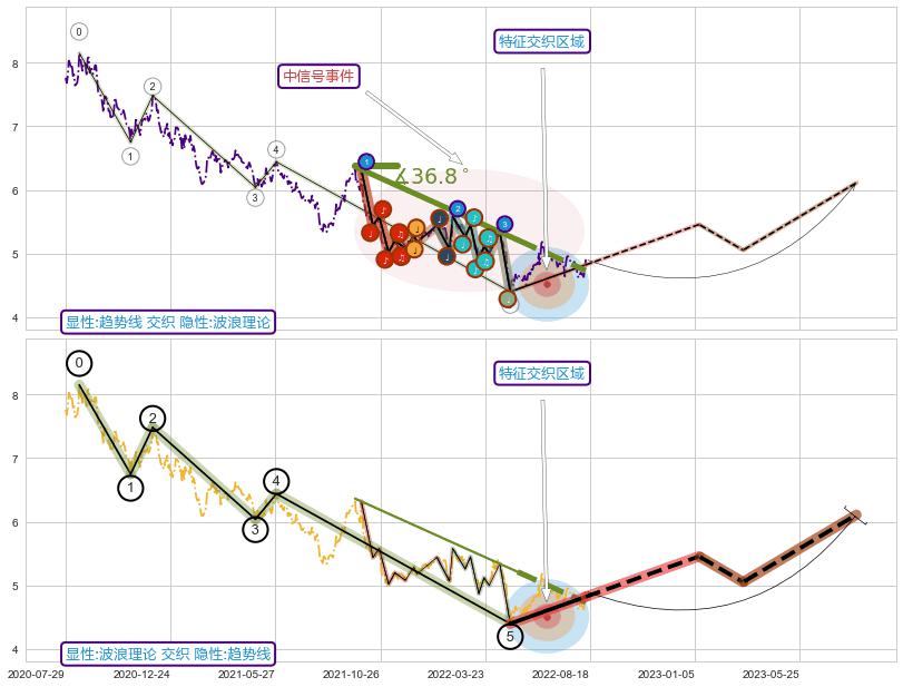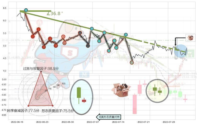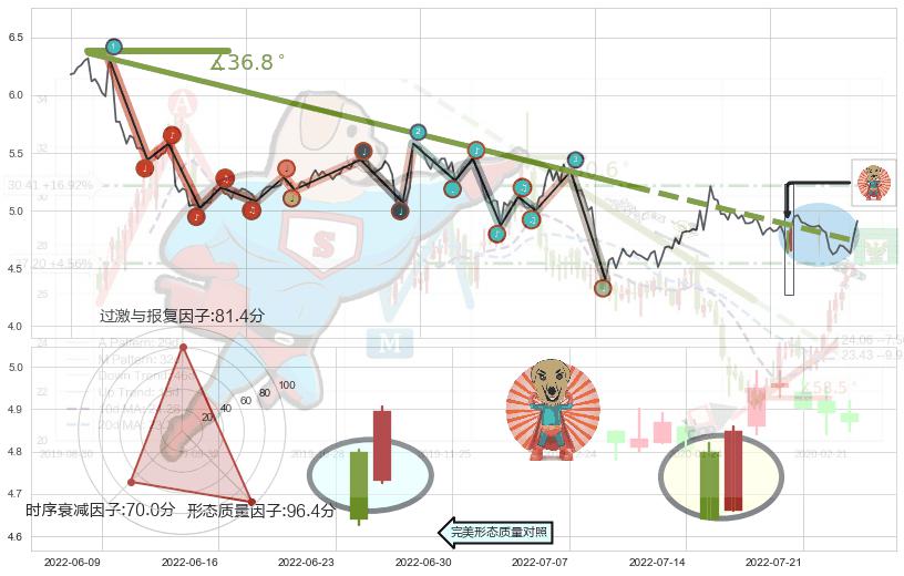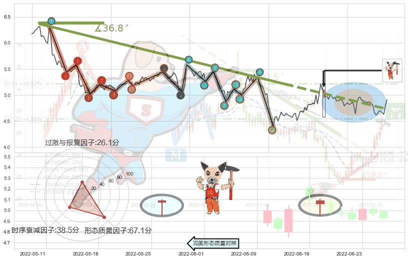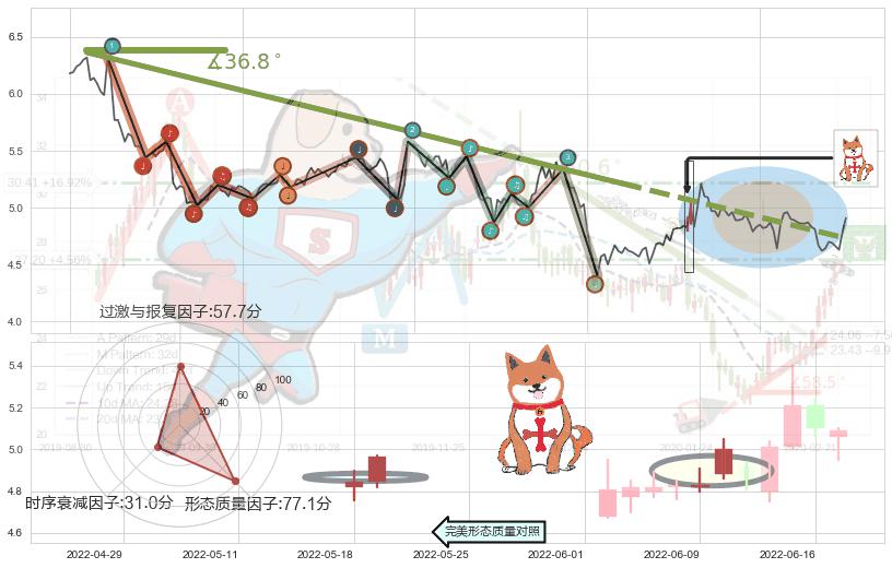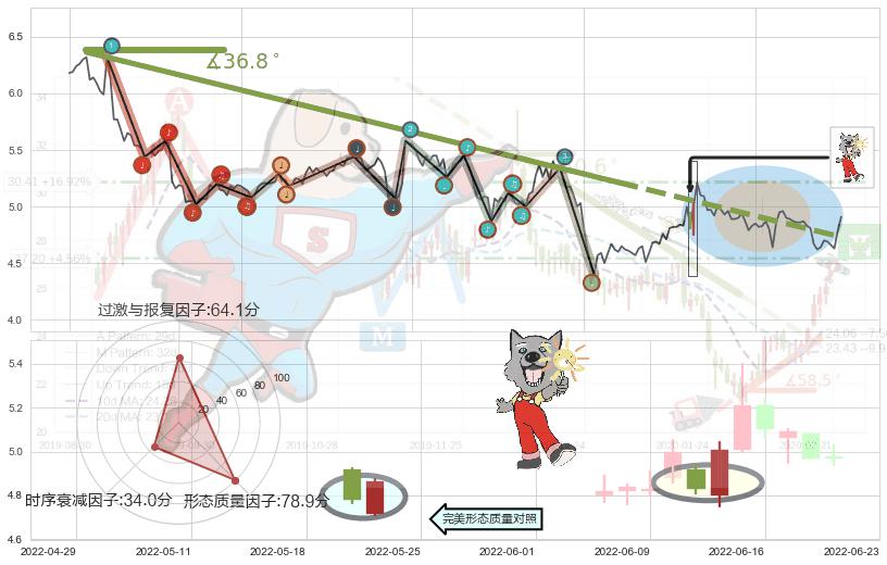 ➢ 2021-09-13-2022-05-12下跌趋势存在反转上涨[机会],虽然原下跌趋势的阻力位(4.73)已被突破,但其阻力效果尚存,原下跌趋势角度: 36.8˚