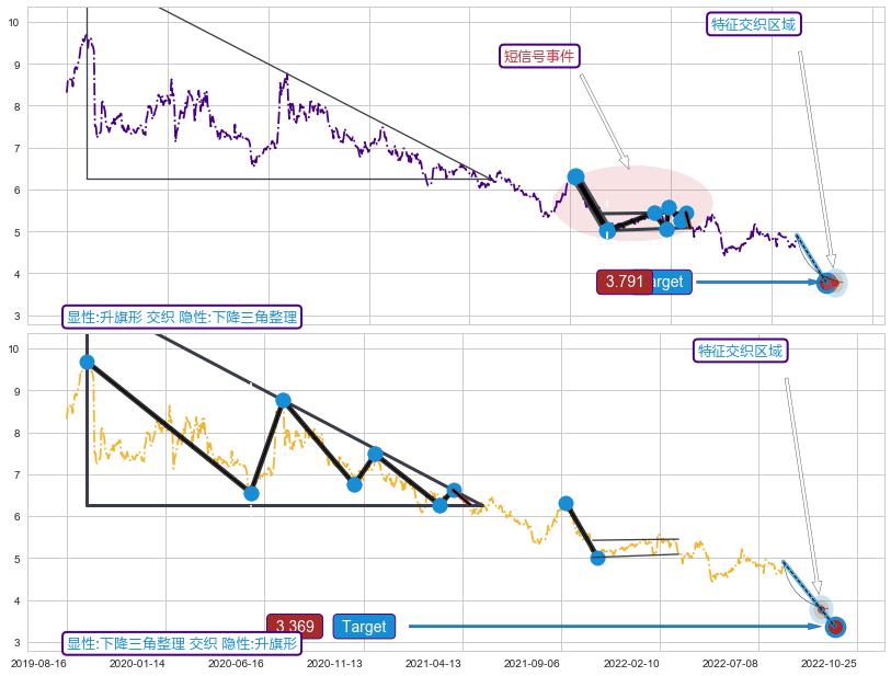➢ 升旗形属【短级别信号事件】下降三角整理属【长级别信号事件】长短周期组合信号事件, 短长事件长度比29.56%