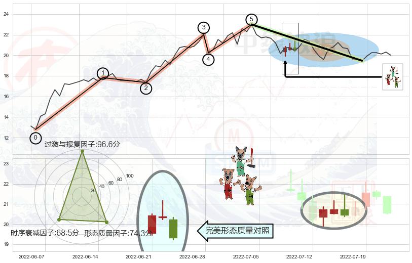 ➢ 🕰 价格走势在2022-07-05至2022-07-11期间形成高档五阴线,残存影响值:-4.59