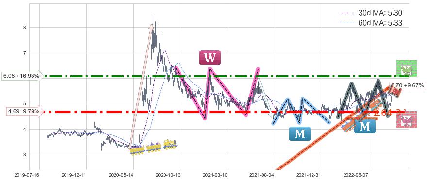 ♘ 阻力价格位6.08,可信任强度70.02%,距离最后交易2022-08-12形成的收盘价格5.20相差 +16.93%