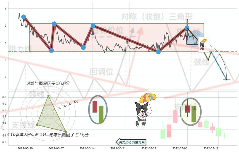➢ 吊颈线(上吊线) 🔜 下跌矩形整理临近支撑猜想转换阻力下跌 综合量化分数:43.21 【偏空】