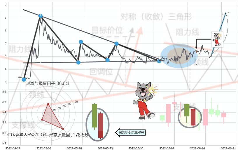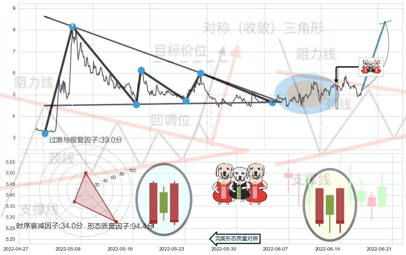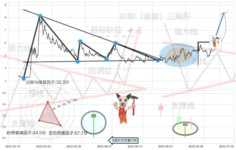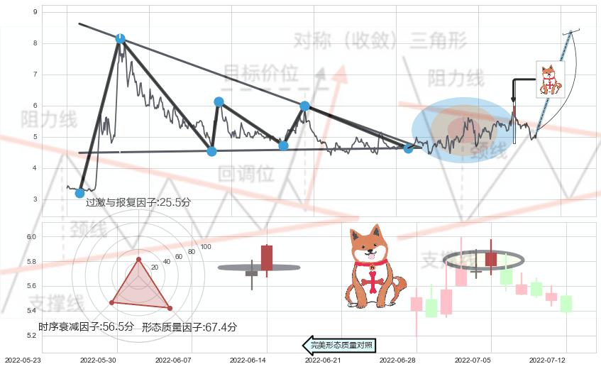 ➢ 锤头线(锤子线) 🔜 上升对称三角整理阻力突破转换支撑上涨 综合量化分数:56.46 【偏多】