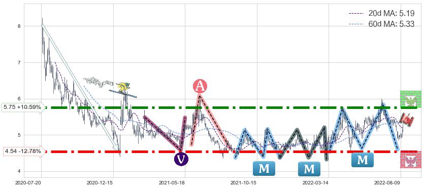 ♘ 阻力价格位5.75,可信任强度90.29%,距离最后交易2022-08-12形成的收盘价格5.20相差 +10.59%