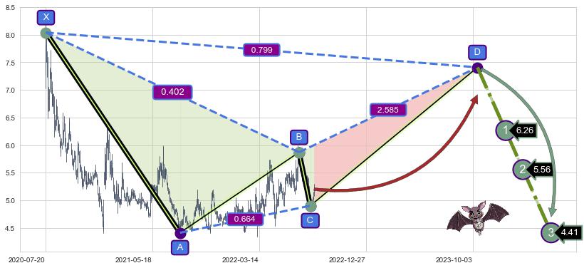 ➣ 谐波蝙蝠:b下跌接近c:猜想支撑性拉升 → 上涨 →【拐点】支撑临近 → 大趋势均值回复